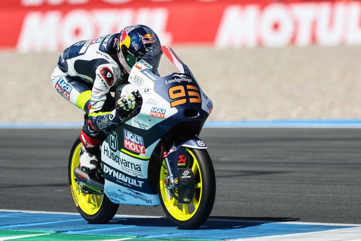 Con el sol brillando sobre el trazado jerezano y la afición en pie desde primera hora, el semáforo de la primera de las tres carreras se apagaba para darnos espectáculo. David Alonso llegaba al domingo en pole y como máximo favorito a todo. La salida nos dejó un primer pequeño toque entre David Muñoz y David Alonso, quienes se mostraron agresivos desde la salida. El adelantamiento de Muñoz sobre Alonso duró hasta la curva seis, donde el colombiano le volvió a arrebatar esa primera plaza, adelantamiento que tampoco duró, yéndose al suelo en la última curva del trazado pero siendo capaz de levantar la moto volviendo a pista en última posición.