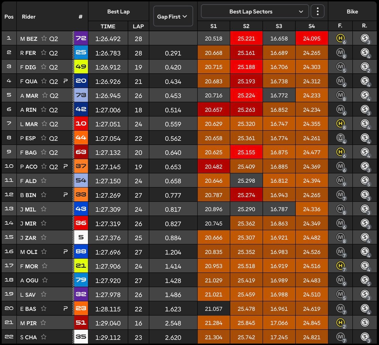La vuelta siguiente fue un mazazo: el de Aprilia bajó el primer 1:26 del día y convirtió la tabla en tierra quemada. Quartararo respondió con otra vuelta en 1:26 para colocar su Yamaha en la segunda fila virtual y mandar a Rins al tercer peldaño provisional. En ese efecto dominó, Bagnaia llegó a verse fuera del Top-10 a cinco del final, obligado a tirar de orgullo en su último ataque, mientras su compañero de box este fin de semana, Michele Pirro, protagonizaba la segunda caída de la tanda.