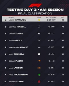 Lewis Hamilton se colocaba primero con un 1:30.080 y el compuesto C3, Russell, Lawson también llevaban ese juego de neumáticos, por parte de los dos pilotos españoles salían a pista con el compuesto más duro y Sainz se quedaba a tan sólo 72 milésimas del mejor tiempo de Hamilton con el Ferrari, mientras que Alonso se colocaba en séptima posición con pocas vueltas sobre el trazado, siguiendo los problemas con los sensores que tuvieron durante el primer día de test. La lluvia se intensificaba y obligaba a todos los equipos a parar en boxes. Haas y Aston Martin eran los únicos dos equipos que tenían neumáticos intermedios, pero solo el equipo americano ha salido a pista a probarlo.