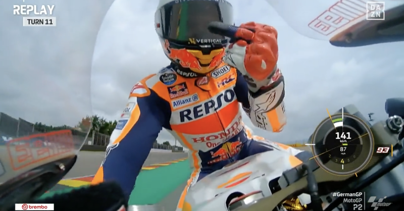 Después del susto Márquez volvía a boxes donde indicaba a sus mecánicos que no quería volver a salir con la moto con la que había sufrido el susto. Al salir con la segunda moto justo antes de llegar al cambio de dirección donde previamente había perdido el control de la moto volvía a tener un susto. De ese susto ha salido negando con la cabeza.