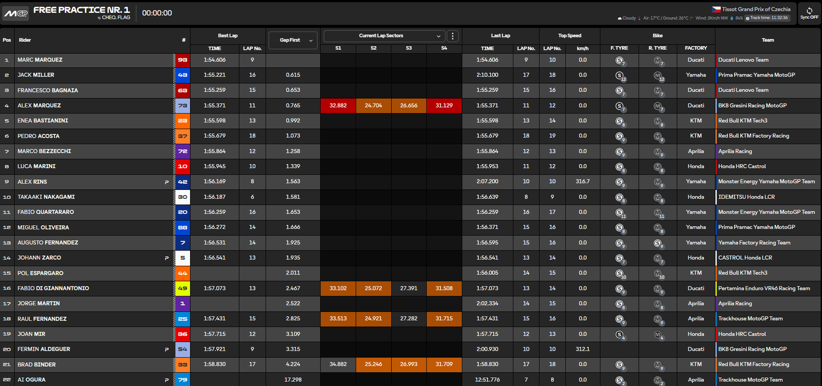 La primera sesión de entrenamientos libres del GP de la República Checa ha arrancado con menos actividad de lo habitual. La lluvia caída en el trazado de Brno dejó la pista mojada en los primeros minutos, condicionando la estrategia de los equipos. La gran noticia del día era el regreso de Jorge Martín, que volvía a subirse a la moto tras casi cuatro meses de ausencia, acaparando todas las miradas en su vuelta a la acción.