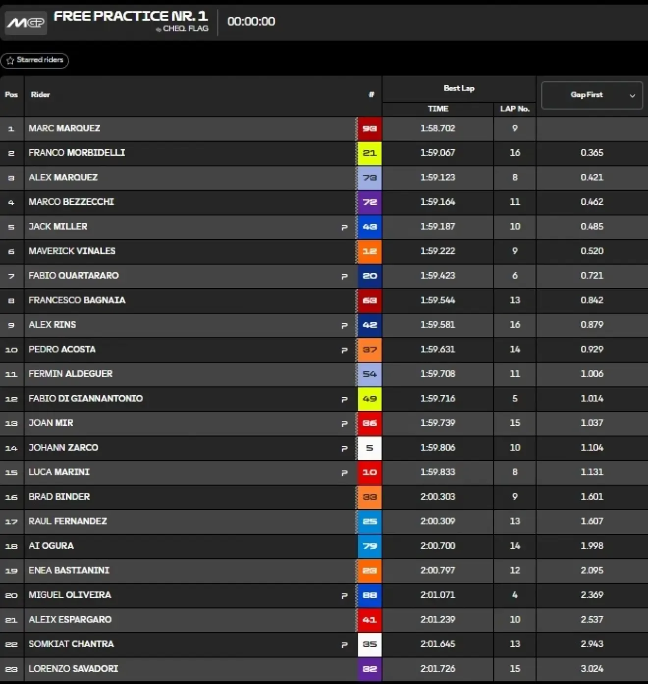 El entrenamiento se desarrolló sin grandes sobresaltos hasta los compases finales, cuando Ai Ogura protagonizó un fuerte accidente en la curva 2. Aunque dolorido, el japonés pudo levantarse por su propio pie. En los últimos minutos, sólo Franco Morbidelli apretó de verdad, montando un juego nuevo de gomas medias que le sirvió para escalar al segundo puesto.