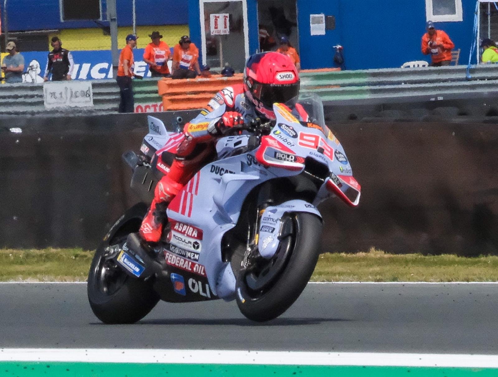 Circuito de Assen (Países Bajos).- Marc Márquez tras una buena salida consolidaba la quinta posición , ganando así dos posiciones. Durante todas las sesiones del fin de semana, parecía que le costaba algo mas que a su compañero de equipo, su hermano Alex Márquez. El de Cervera se iba al suelo en la segunda vuelta al perder la rueda delantera, después de tocar el piano en la carrera al sprint.