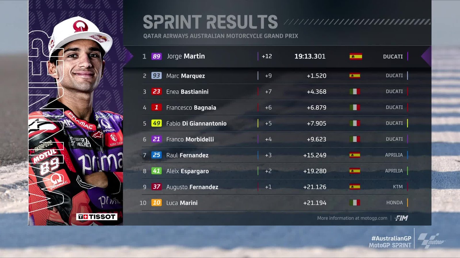 Jorge Martín ha hecho los deberes en el sábado de Australia, pole y victoria de la sprint liderando de principio a fin. Segundo ha sido Marc Márquez, que pese a haber tenido una buena salida, le ha tocado remontar al perder posiciones en la primera curva. Y, tercero, Enea Bastianini, que ha superado a su compañero Pecco Bagnaia aprovechando el adelantamiento de Marc. Una cuarta posición que deja a Martinator un poco más líder, a dieciséis puntos.